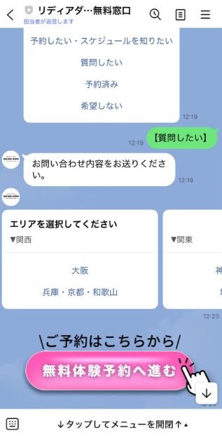 「質問したい」をタップすると、無料体験予約のご案内が流れます。